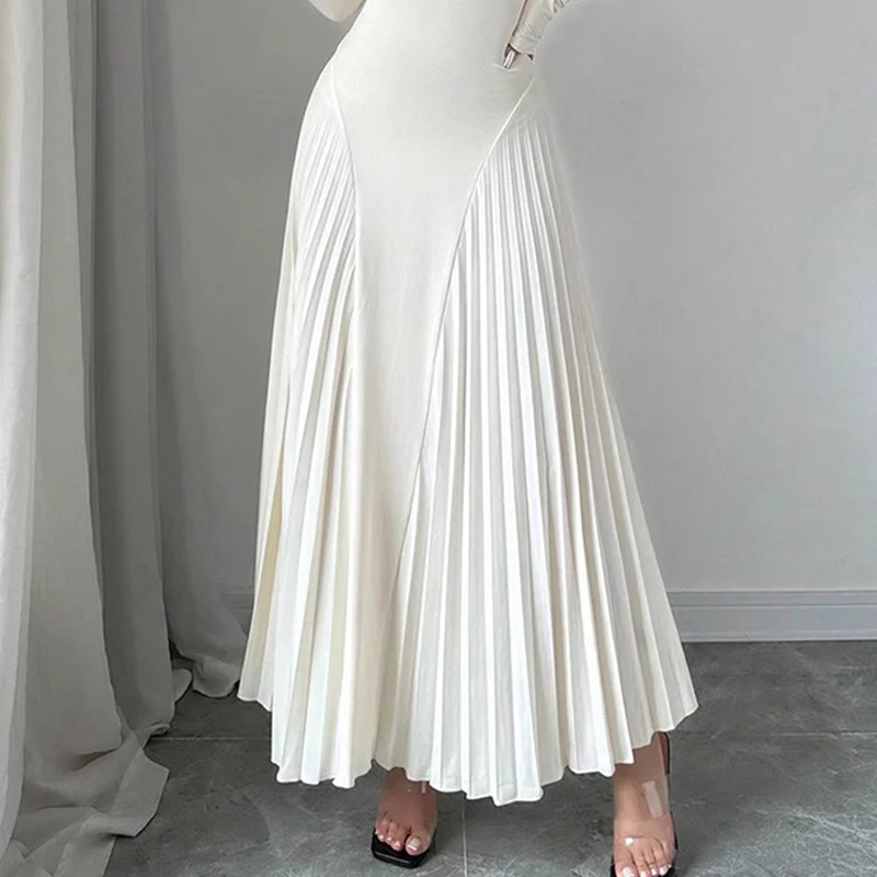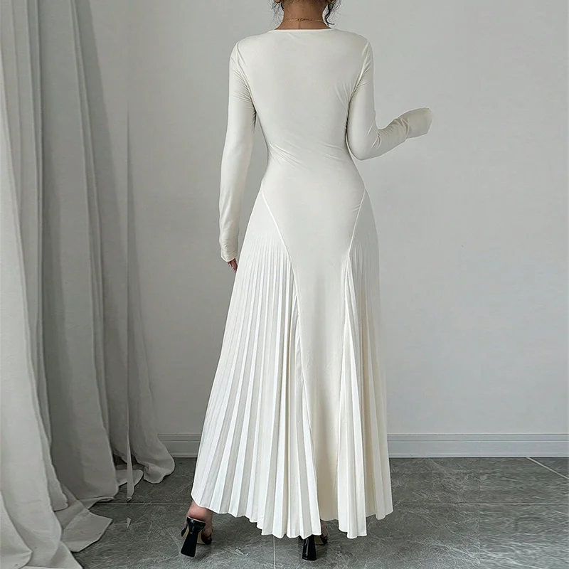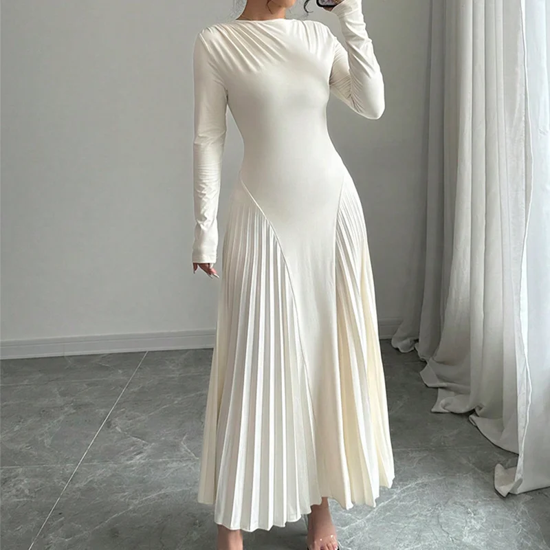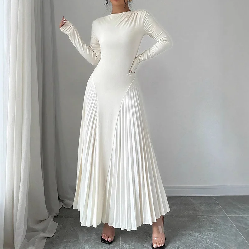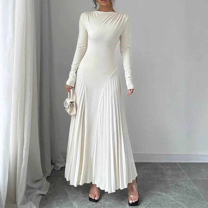 Custom Long Sleeve Boat Neck Dress Pleats A-Line Slim Waist Women Maxi Dress
