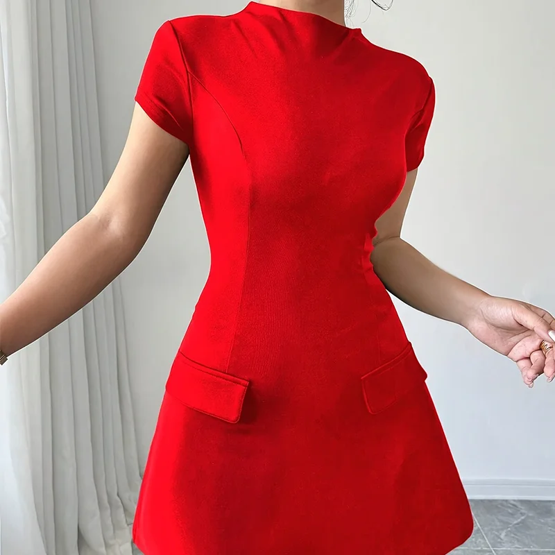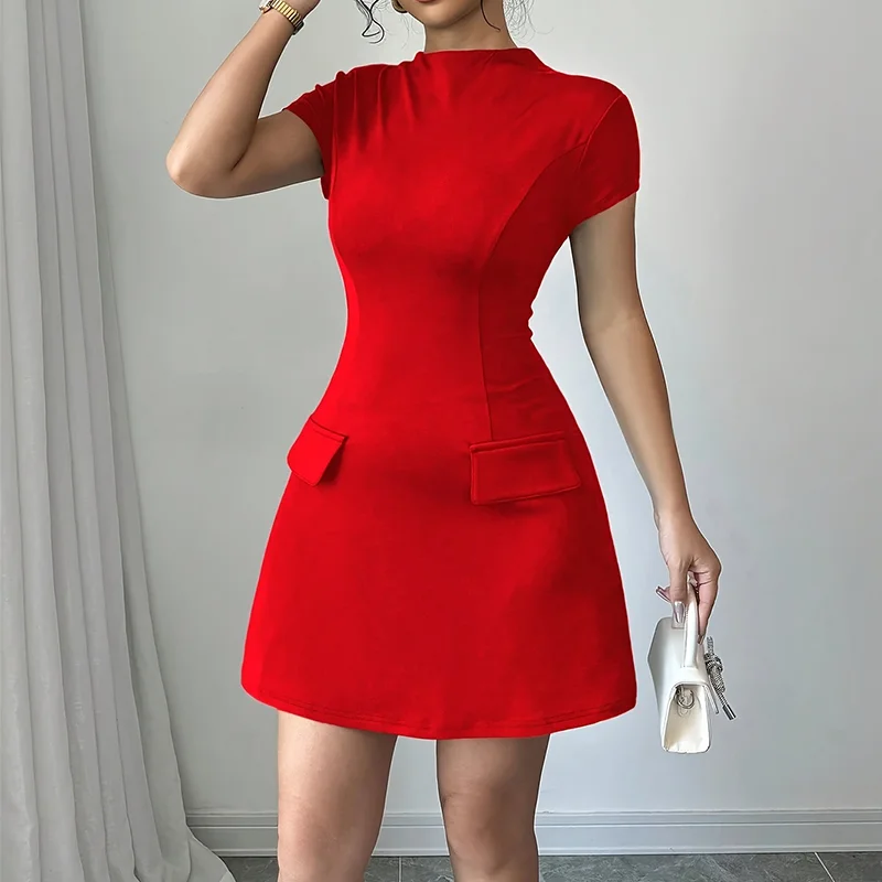 Vintage O-Neck Flying Sleeve Empire Slim Casual A-Line Pockets Dress Commuting Robe Office Lady’s Elegant Solid Mini Dress