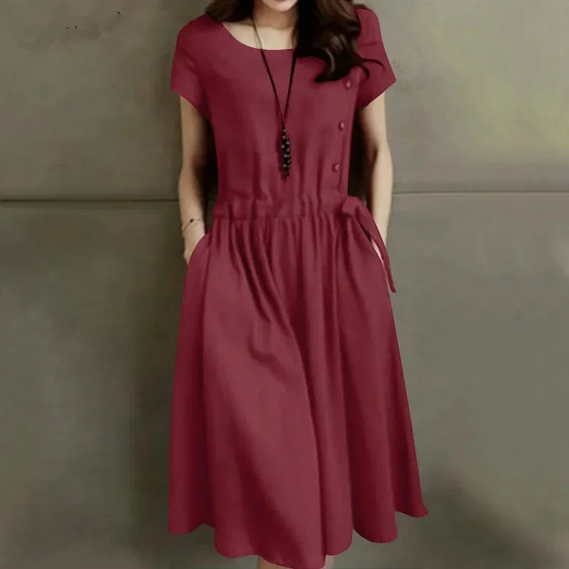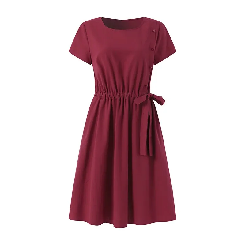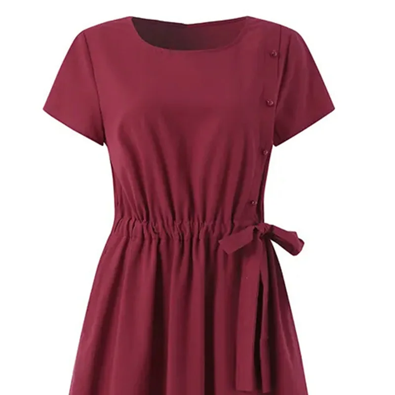 Women’s O Neck Casual Dress Short Sleeve Polyester A-Line Above Knee Dress Front Buttons Tie Waist Dress