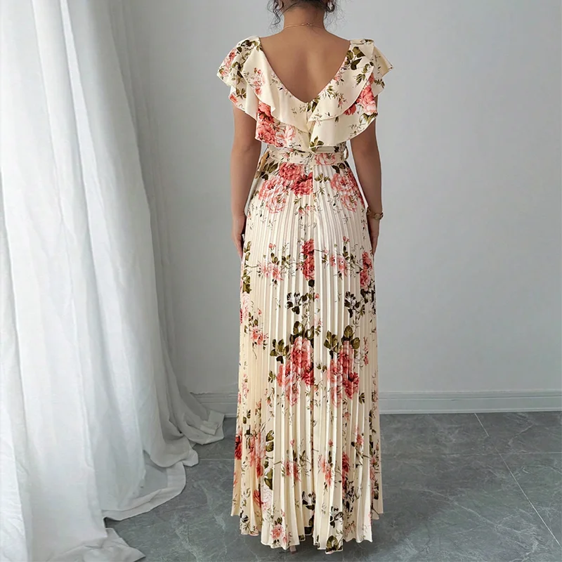 Custom Sexy Sleeveless Flower DTG Prints V Neck Tie Bow Pleats Dress Slimming Fit Maxi Dress